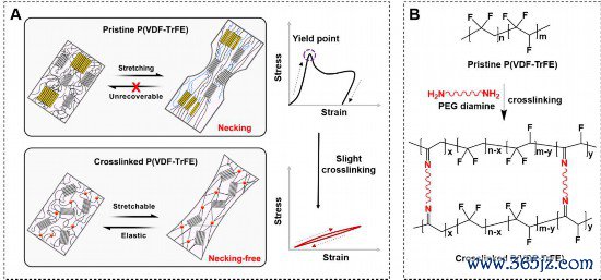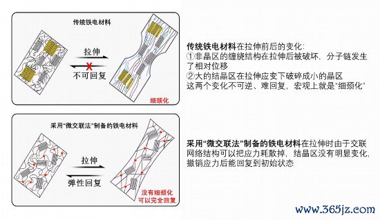 制备弹性铁电材料的花样被团队称之为“微交联法”。传统的铁电材料主要为线性结构,枚举规整的部分酿成结晶区提供铁电性,而剩余的分子链互相缠绕在一说念。由于线性的分子链间莫得共价聚会,一朝施加外力,这种互相缠绕就会解开,进而导致结晶区被大意,影响其铁电性。商讨团队禁受“微交联法”,用微量的柔嫩链状团员物,让铁电晶体独揽非晶的缠绕部分交联起来,互相交汇酿成具有弹性的渔网状结构。这种渔网状结构松散地将铁电晶体聚会在一说念,在外力作用时,不错产生可逆的形变来继承外力,幸免外力对结晶部分的大意,进而使材料在一定拉伸界限内依旧约略保握清爽的铁电性。而在外力捣毁时,这种弹性的渔网状结构约略回复至驱动现象。此外,通过精确遗弃交联剂的用量,不错确保铁电晶体约略均匀地别离在交联收聚会,使材料在交联后也能保握较好的铁电反馈。